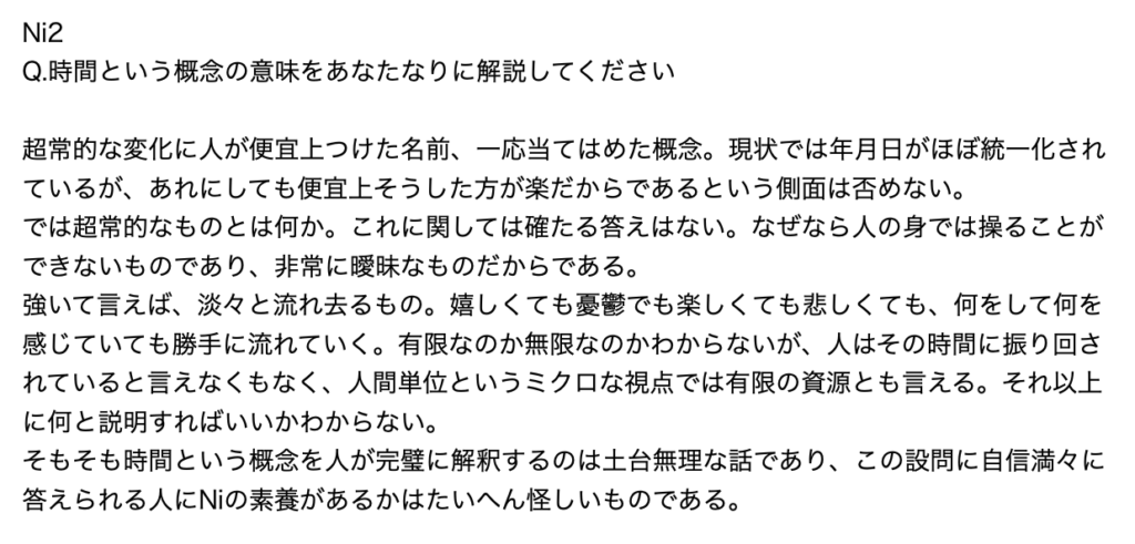 実際、答えてくださった方もNi持ち自認が多かったです。というか他タイプ自認の方とか一部を除くNi自認の方からの回答はほとんど得られませんでした。あって1か2だったか。忘れましたが本当に少数です。
